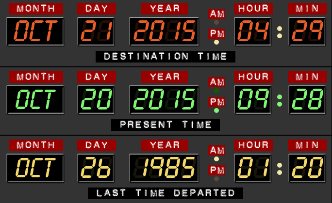 It's Back to the Future Day, Oct. 21, 2015, the date programmed in 1985 by Doc Brown in his stainless DeLorean time machine in the second part of the Back to the Future movie
