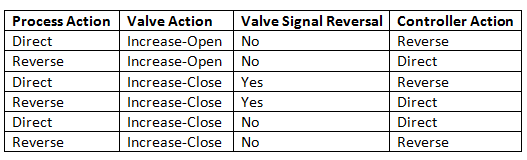 In this case, the positioner could possibly reverse the signal to the actuator causing an “Increase-Close” valve to close. It is important to standardize on the location of the signal reversal to ensure that it is done and done only once. Table 1 summarizes how the controller action depends upon both the process and valve actions and on the signal reversal.