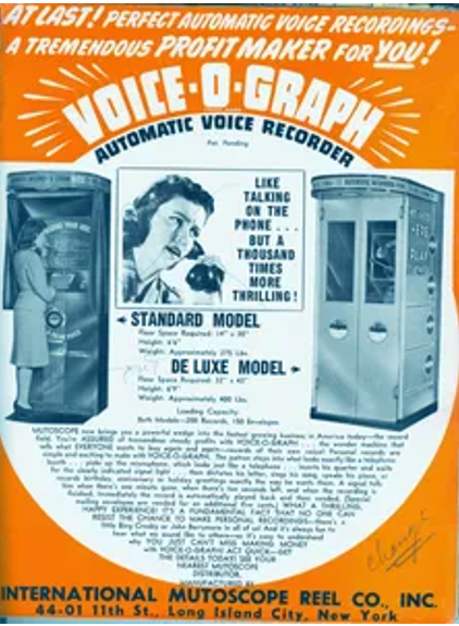 The Voice-O-Graph is an innovation that you would never have realized had existed when it did. It was invented by a European engineer named Alexander Lissiansky and patented by Mutoscope in the US in 1940. A version of Voice-O-Graph was exhibited at the New York World’s Fair in 1939. There are very few Voice-O-Graphs in existence today, but there is a Facebook group and a website where you can learn more.
