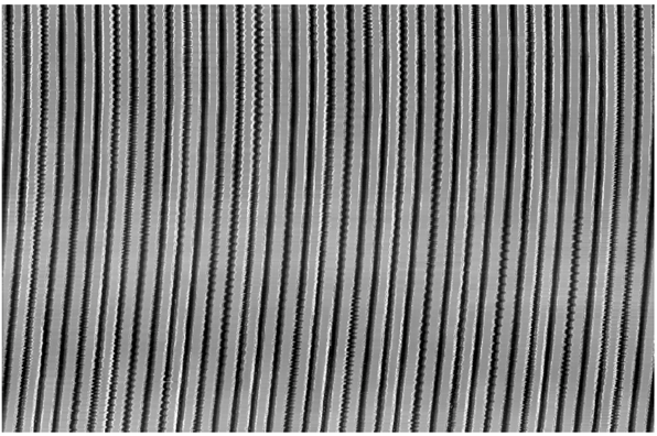 One of the challenges was not so much the damage to the surface of the disc, but the low level of modulation of the voice signal. You can see this in the image below, which shows the grooves of the disc with very little wiggle compared to a similar disc with better voice modulation. Note how the black lines in the lower image show a more distinct zig-zag pattern.