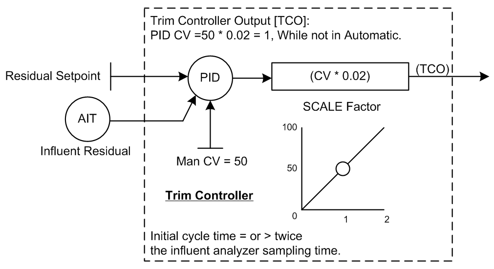 10. Control strategy. Is the influent residual measured used for control? In automatic control, is the operator able to set the automatic control for flow pace only and also able to set the system to flow pace plus trim control? Is the operator able to change the dosage (mg/l)? If using bleach, is the operator able to change concentration (%) and specific weight (lbs./gal)? Once all items in the checklist above have been checked off, the trim controller PID must be configured and initial tuning parameters calculated. The initial cycle time (time between executions, also known as task period) must be set to equal or greater than twice the influent residual analyzer sampling time. This means that the trim controller output, which is also the correction factor, updates once every time the cycle time elapses. The scale factor shown provides a bump-less transfer to trim mode functionality (Figure 1).