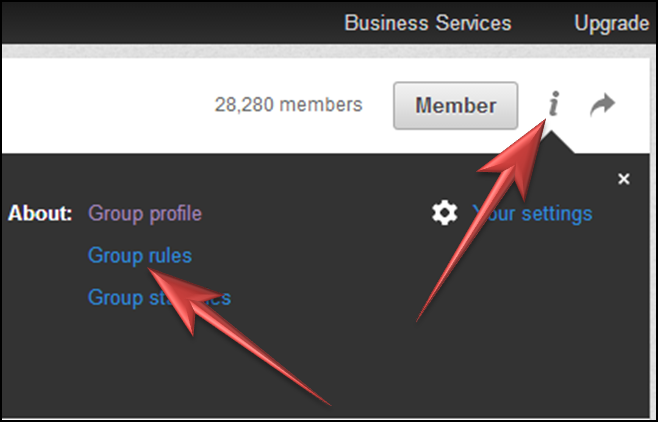 Before you jump into a group to showcase your brand, your first step should be to survey the contributions of the group, assess the tonality of the discussions and read the group rules. Rules? Yes, most actively managed groups have published rules that are more or less guidelines on acceptable content. Unfortunately, LinkedIn buried the group rules link in a recent system update. You’ll find the rules by first clicking on the graphical letter “i” in the upper right hand corner of the screen, then select “Group rules” from the menu options.
