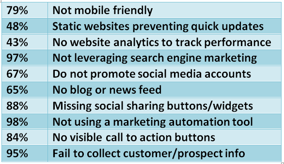 3) Problem: You’ve built a great website with fresh, compelling content, but there’s no way to engage with customers and business prospects. The majority of websites in the survey did not employ common methods to gather contact information from prospects or readers to join opt-in mailing lists, which is often cited as the most important sales tool on a website. In the new digital marketing paradigm, your website or blog is where you educate, inform and entertain. Your opt-in email list is your most direct way to communicate and engage with your followers, customers and prospects. Email marketing delivers incredible ROI, and virtually every digital marketing expert points to an email list as the most valued marketing tool.