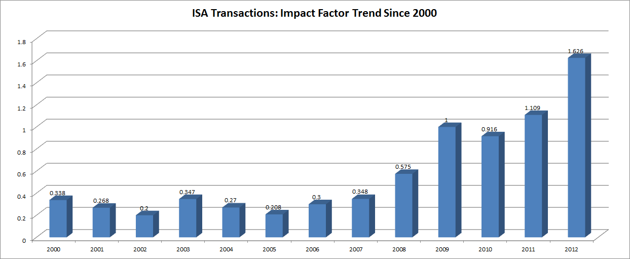 This year, the JCR rated ISA Transactions 46 percent higher on the Impact Factor scale than the previous year. And among all professional journals relating to instrumentation, control, and automation, ISA's journal earned the highest five-year rate of increase in the JCR rankings.