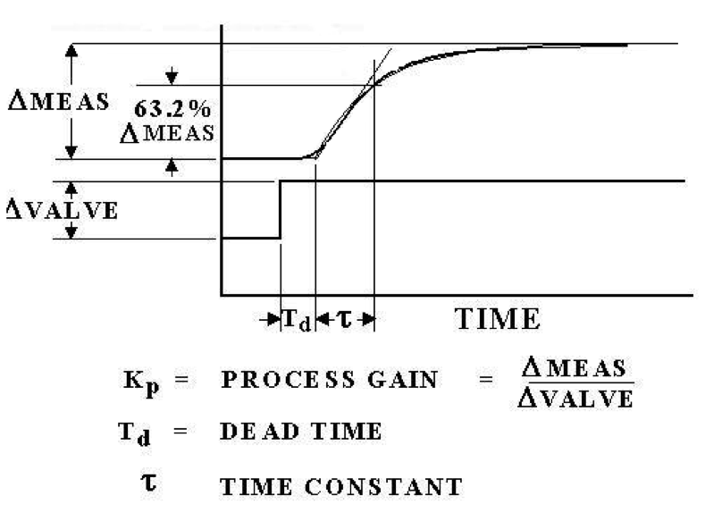 The 63.2% answer is the time that elapses from the first observable or measurable response in the process reaction curve and the controlled variable reaching 63.2% of its final value. Example: If the controlled variable starts at a setpoint of 300 degrees Fahrenheit and changes to a maximum peak value of 350 degrees Fahrenheit, the elapsed time required to reach a temperature of 331.6 degrees Fahrenheit is the process time constant. The example only applies to a process that can be defined as a first order lag plus dead time. (FOLPDT).