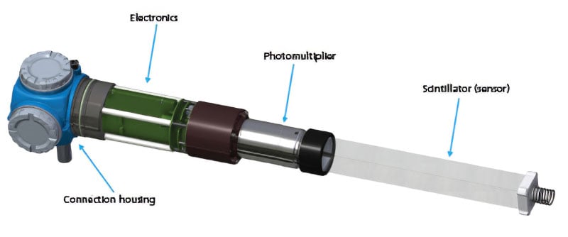 The purpose of the detector is to detect and quantify the amount of radiation received. In older gamma systems, an ion chamber was typically used in density applications. Modern detectors use a scintillator tube sensor. The scintillator tube absorbs the gamma photon and converts it into a light pulse. These light pulses create a photoelectron at the photo cathode, where they are multiplied and converted to an electrical pulse. These pulses or counts determine how much radiation is being received by the detector. With a scintillation detector tube made of sodium iodide (NaI) crystal or PVT plastic, the energy required to make an accurate measurement is minimal. For example, an 18-inch slurry pipeline might need a 250-mCi Cs-137 source to have enough activity for the older type of ion detector to work.