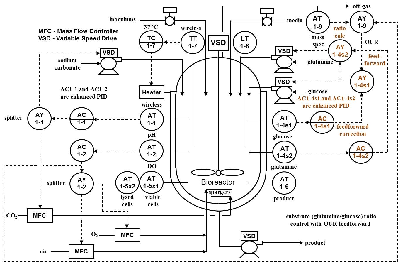 Online and at-line analyzers enable substrate concentration control with glutamine feed ratioed to glucose. An OUR feedforward anticipates changes in glucose utilization rate.