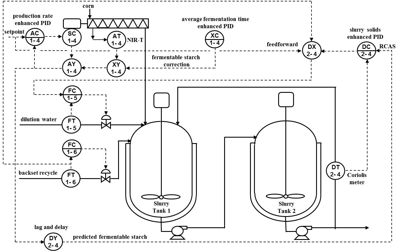 Since the PID compensates for dead time, ignores noise, and waits out feedforward timing errors, the PID gain can be increased to provide a faster setpoint response. The feedforward signal from the change in Slurry Tank 1 prevents the changes in production rate from affecting the solids concentration in Slurry Tank 2. The feedforward signal is the production rate setpoint minus the water flow from other sources such as backset. The remote cascade (RCAS) setpoint is the desired solids concentration multiplied by a fermentable starch factor predicted by the corn analyzer. The prediction passes through a delay and lag set equal to the dead time and residence time, respectively, so the change in setpoint coincides with the change in solids measurement from a change in corn feeder speed from the production rate controller.