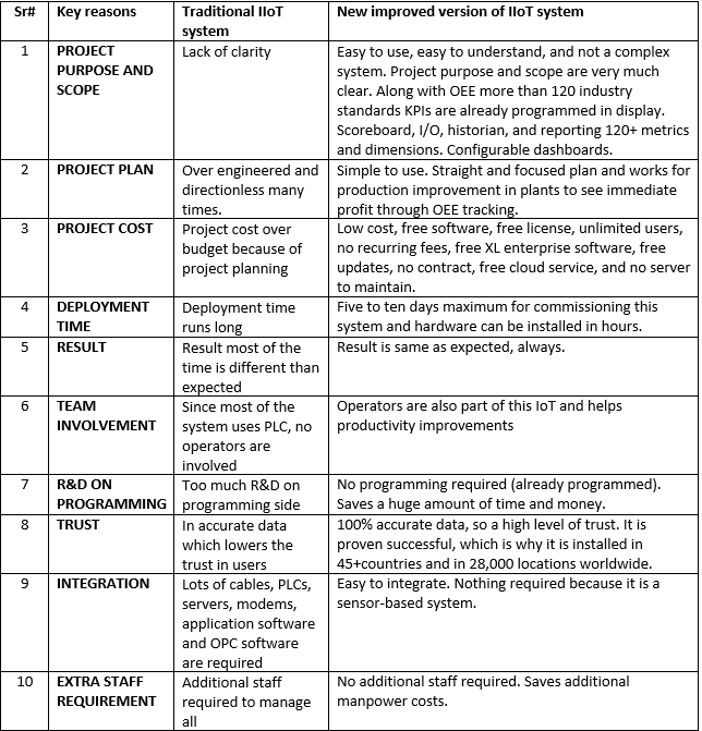Our solution is not like any traditional, expensive, and lengthy way of doing IIoT as is sometimes done by other automation companies. Here we use different tactics. The table below shows a summary of IoT improvements based on my IIoT experience in the last few years (click for high-res version).