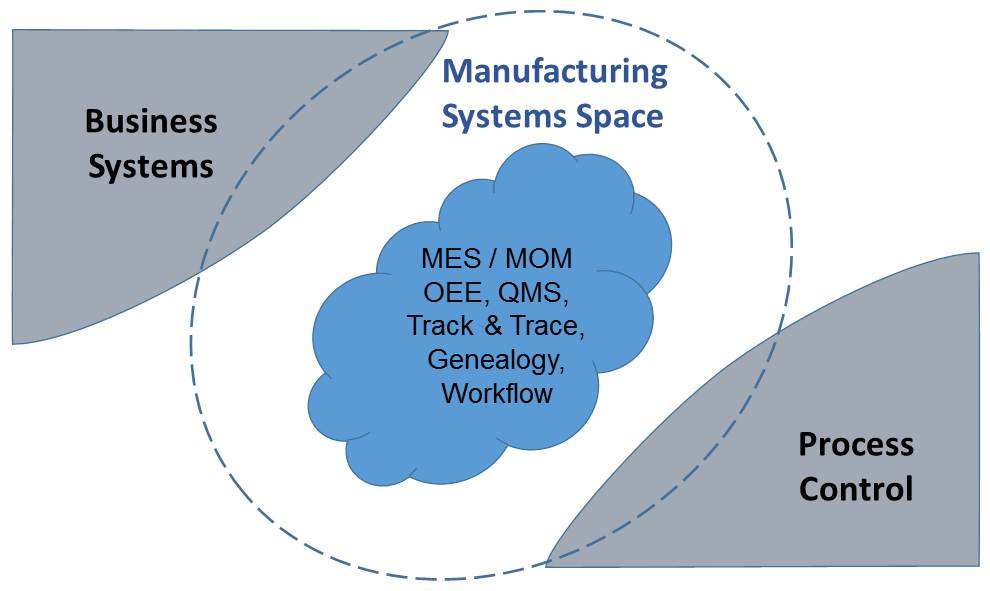 For purposes of this discussion I will try to avoid specific subcategories of specialized functions and address the broad category of manufacturing systems that are above the control system layer. These particular systems, depending upon the type of process and industry, directly control the PLC or DCS process. I also exclude the ERP systems that support the broader business functions beyond the manufacturing process. The area under discussion is shown conceptually in the diagram below.