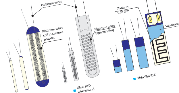 A wire-wound RTD consists of fine coiled wire wrapped around a ceramic or glass element, then placed in a sheathed probe for protection (see figure 1). Thin-film RTDs have a platinum coating over a ceramic substrate. Thin-film RTDs are not as susceptible to vibration as wire-wound RTDs but typically are more limited in their applicable temperature range.