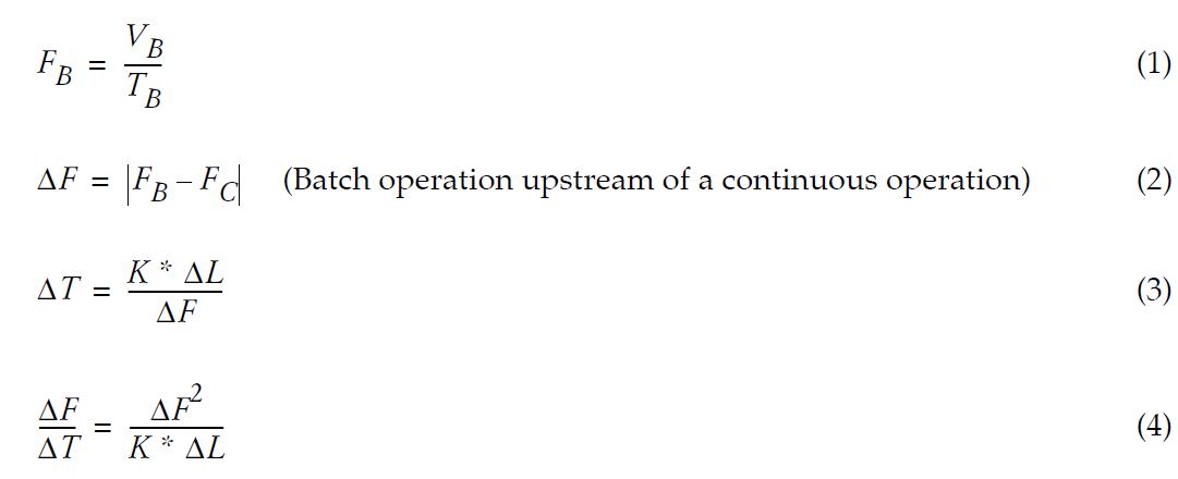 A solution is an adapted rate limited feedforward for level control. The total batch volume (VB) divided by the current batch cycle (TB) time is the average batch volumetric flow (FB) (Equation 1). The absolute value of the difference between the current continuous flow (Fc) and the average batch flow is the flow unbalance (ΔF) (Equation 2). The difference between the current surge tank level and the alarm level (ΔL) multiplied by the dimension factor (K) and divided by the flow unbalance is the time to the level alarm (ΔT) (Equation 3). The factor converts from percent level to volume. The rate limit (ΔF/ΔT) is the flow unbalance divided by the time to the alarm (Equation 4). For an unbalance that is increasing and decreasing level, the time (ΔT) is the time to reach the high and low alarm, respectively.