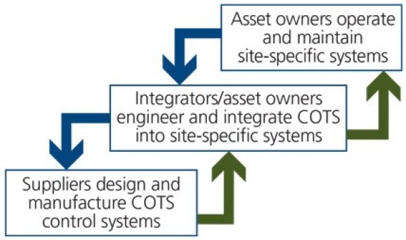 The blue arrows show that the end users have a working relationship with the integrators to triage cybersecurity issues discovered in their operations, and the integrators and product suppliers have a working relationship to triage cybersecurity issues and develop responses, possibly including product patches and updates to the operating site systems. At each level, the issue may be caused by product defects (including documentation), a process deficiency, or a personnel-related issue (training, education, process discipline).