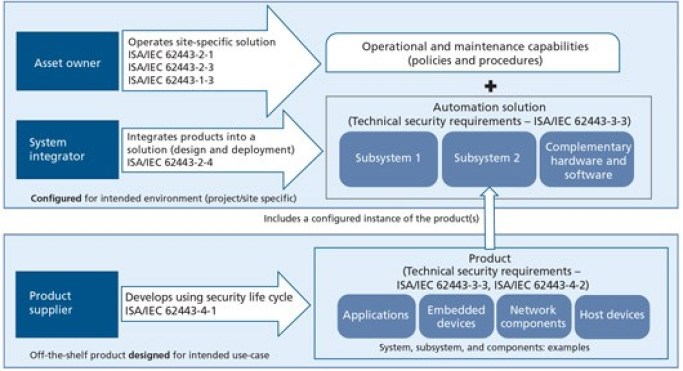 Starting at the bottom of the diagram, there is the product supplier and the two relevant, forthcoming standards: ISA/IEC 62443-4-1, Secure Product Development Lifecycle Requirements and ISA/IEC 62443-4-2, Technical Security Requirements for IACS Components. These two standards describe requirements for the IACS security development life cycle and the IACS technical security requirements, respectively. ISA/IEC 62443-4-1 includes requirements for ensuring that products are secure by design and maintain security over the life of the products. ISA/IEC 62443-4-1 is an organizational process standard specific to cybersecurity of IACS products.