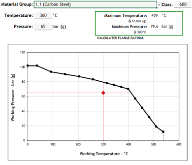 A common material of construction for main piping is carbon steel (A105) which is a group 1.1 material. I’ve shown the PT derating curve for group 1.1 below, with a fictional P&T design of 65 bar(g) & 300°C. A piping engineer will provide a 600# flange as standard in this service, in-line with the pipe class.
