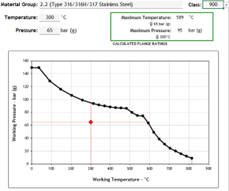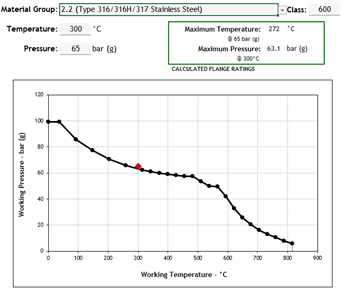 In the above instance, the same design pressures and temperatures used in the group 1.1 case above now exceed the flange ratings for group 2.2 materials in 600#. This instrument will need to be uprated to comply with B16.5. I’ve assumed that the next available class would be 900#.