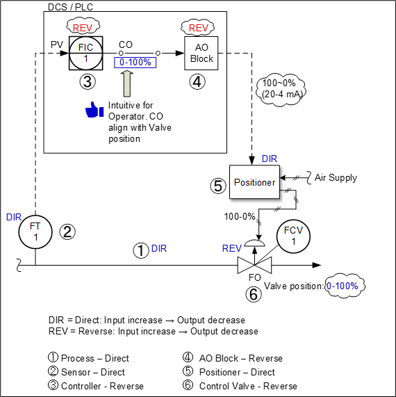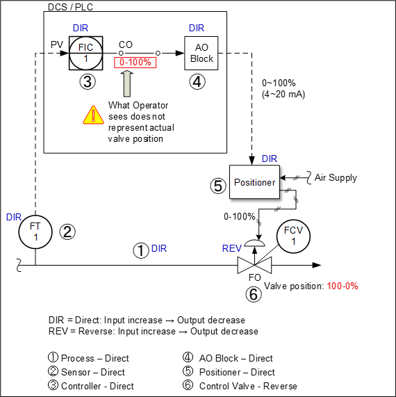 For control loop with FO valve, we usually see the opposite, whereby the controller is configured in such a way that it’s CO indication on human-machine interface (HMI)/DCS graphics is not aligned with valve position. For example, 20% CO means commanding the valve to be 80% open. In the event that intervention by an operator is required, when the valve is demanded to be fully closed, the operator may fully open the valve if he accidentally keys in a CO of 0%.