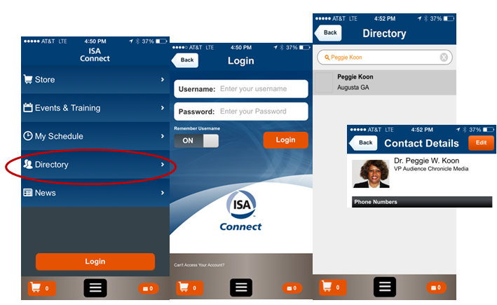 Using the Directory feature of the App you can look up ISA members using the Search function, find their contact information, and connect with them instantly via your smartphone