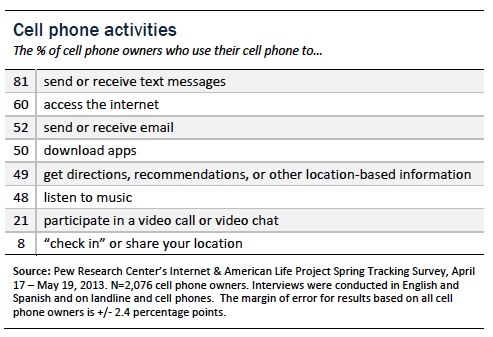 An April 2012 survey found that “some 70% of all cell phone owners and 86% of smartphone owners used their phones in the previous 30 days to perform at least one of the following activities: