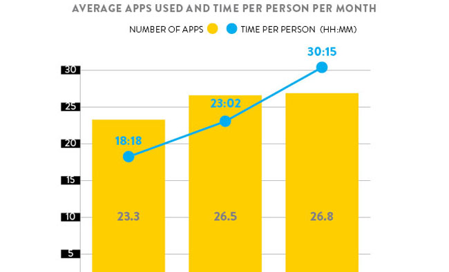 Also according to Phil Tran, “Every month, smartphone users spend an average of 30.25 hours on 26.8 apps.”