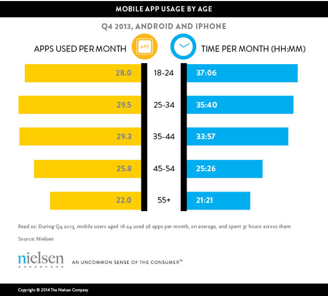 The article goes on to say: “Not surprisingly, the highest amount of time spent on apps goes to the young age group in the survey: 18- to 24-year-olds. They spent approximately 37 hours and six minutes while those older than 55 spent only 21 hours and 21 minutes.”